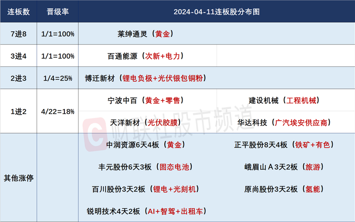 财联社4月11日讯,今日47股涨停,22股炸板,封板率为68%,莱绅通灵8连板,百通能源4连板,博迁新材3连板,建设机械、华达科技、宁波中百、天洋新材2连板,中润资源6天4板,丰元股份6天3板,峨眉山A、原尚股份、百川股份3天2板,锐明技术4天2板。盘面上上涨和下跌个股家数基本相当。沪深两市今日成交额8128亿,较上个交易日缩量172亿。板块方面,工程机械、Sora概念、旅游、核污染防治等板块涨幅居前,低空经济、猪肉、军工、染料等板块跌幅居前。截至收盘,沪指涨0.23%,深成指涨0.03%,创业板指跌0.44%。北向资金全天净买入20.22亿,其中沪股通净卖出1.02亿元,深股通净买入21.24亿元。