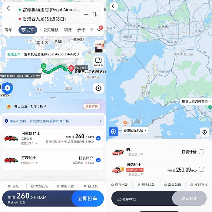 高德的打车界面显示,目前在香港有“包车价的士”和“打表的士”两个选项。高德方面称,该服务是与香港出租车车行进行合作,模式类似内地的“巡网融合”(向传统巡游出租车赋予网约功能),并非全部网约车服务。