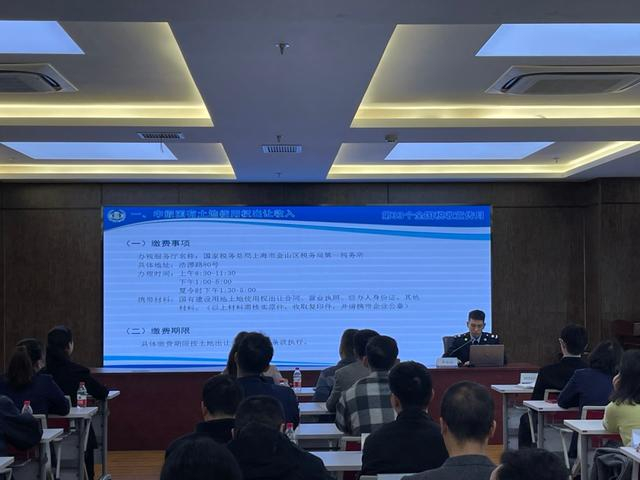 金山区税务局联合区规划资源局对区内房地产企业开展专题培训,介绍相关税费政策,演示如何在线申报国有土地使用权出让收入和契税,现场为参训人员疑惑答疑。