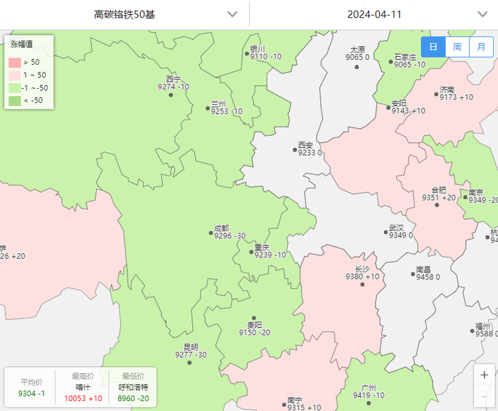 今日合金宝指数价格:高碳铬铁50基价(含税报到价):河北地区:9065元(↓10);山东地区:9173元(↑10);辽宁地区:9303元(↓10);江苏地区:9349元(↓20);四川地区:9296元(-);湖南地区:9380元(↑10);具体如下: