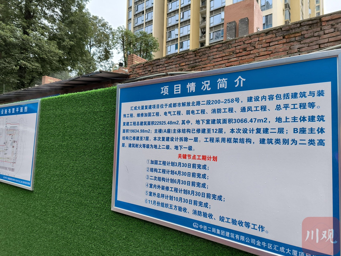 这个看似简单的时间表背后,是多方面努力的结果。举一个简单的例子。汇成大厦项目属于双业主公司开发模式,而其中一家业主公司,早在多年前就被吊销了营业执照。项目重启后,仍需要项目业主方继续出面,进行相关手续的报建等,“这种情况工商部门此前从未遇到过,但在这个项目上,住建、市场监管等部门给予了很大支持。”金牛区住建交局机关党委书记李君先说道,仅仅是区级,就有十多个部门、单位参与到了汇成大厦续建中。
