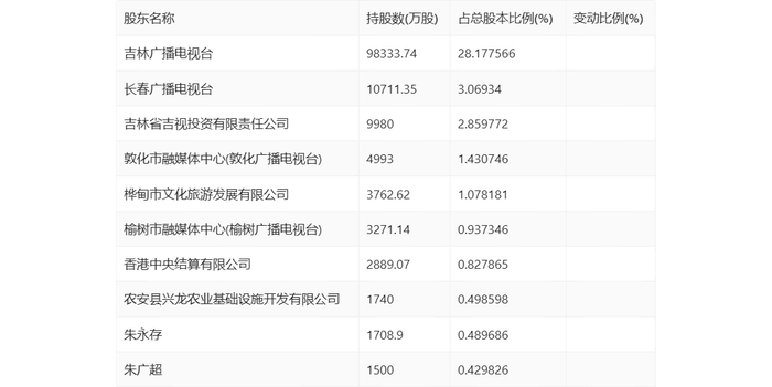 年报显示,2023年年末公司十大流通股东中,新进股东为香港中央结算有限公司、朱永存,取代了三季度末的延吉市融媒体中心(延吉广播电视台)、夏重阳。在具体持股比例上,吉林广播电视台、长春广播电视台、吉林省吉视投资有限责任公司、敦化市融媒体中心(敦化广播电视台)、桦甸市文化旅游发展有限公司、榆树市融媒体中心(榆树广播电视台)、农安县兴龙农业基础设施开发有限公司、朱广超持股有所下降。