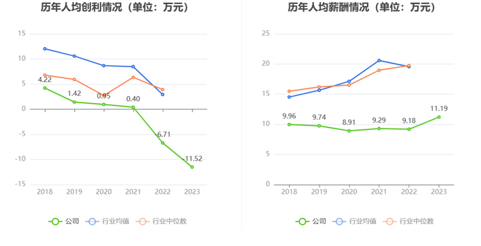 截至2023年末,公司员工总数为6013人,人均创收26.60万元,人均创利-11.52万元,人均薪酬11.19万元,较上年同期分别变化-7.27%、-71.70%、21.90%。