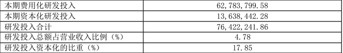 2023年全年,公司研发投入金额为7642.22万元,同比下降12.80%;研发投入占营业收入比例为4.78%,相比上年同期下降0.05个百分点。此外,公司全年研发投入资本化率为17.85%。