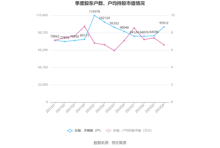 筹码集中度方面,截至2023年年末,公司股东总户数为9.59万户,较三季度末增长了1.13万户,增幅13.38%;户均持股市值由三季度末的7.41万元下降至6.62万元,降幅为10.66%。