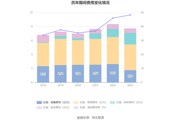 2023年,公司期间费用为7.75亿元,较上年同期减少6183.58万元;但期间费用率为48.43%,较上年同期上升2.29个百分点。其中,销售费用同比下降32.64%,管理费用同比下降4.65%,研发费用同比下降5.98%,财务费用同比增长39.01%。