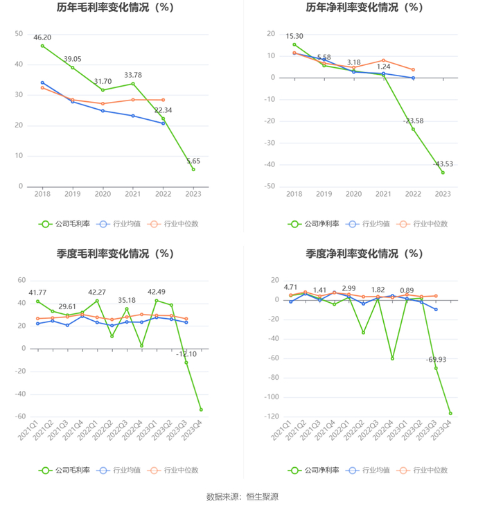 2023年,公司毛利率为5.65%,同比下降16.69个百分点;净利率为-43.53%,较上年同期下降19.95个百分点。从单季度指标来看,2023年第四季度公司毛利率为-53.64%,同比下降56.15个百分点,环比下降41.54个百分点;净利率为-116.39%,较上年同期下降56.26个百分点,较上一季度下降46.46个百分点。