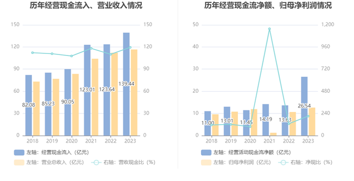 2023年,公司营业收入现金比为119.53%,净现比为210.39%。