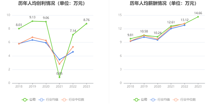 截至2023年末,公司员工总数为14400人,人均创收81.01万元,人均创利8.76万元,人均薪酬14.66万元,较上年同期分别增长7.60%、22.67%、11.76%。