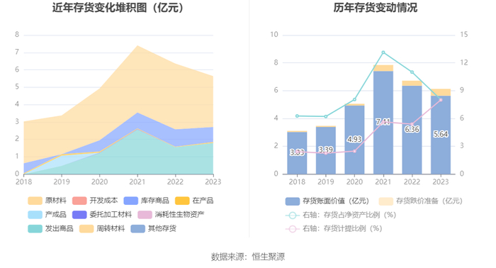 从存货变动来看,截至2023年年末,公司存货账面价值为5.64亿元,占净资产的8.04%,较上年末减少7259.98万元。其中,存货跌价准备为4906.25万元,计提比例为8.0%。