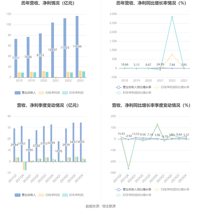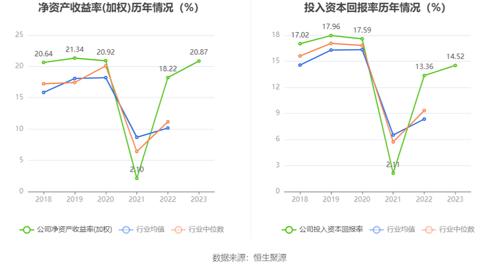 数据显示,2023年公司加权平均净资产收益率为20.87%,较上年同期增长2.65个百分点;公司2023年投入资本回报率为14.52%,较上年同期增长1.16个百分点。