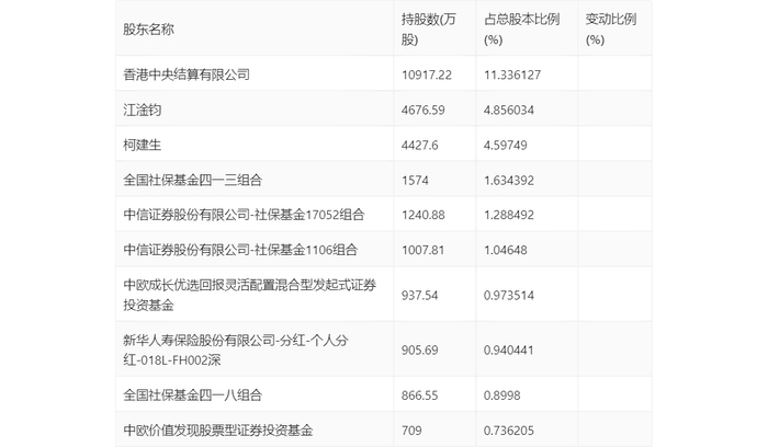 年报显示,2023年年末公司十大流通股东中,新进股东为中欧成长优选回报灵活配置混合型发起式证券投资基金,取代了三季度末的基本养老保险基金一二零四组合。在具体持股比例上,全国社保基金四一三组合、中欧价值发现股票型证券投资基金持股有所上升,香港中央结算有限公司、江淦钧、柯建生、中信证券股份有限公司-社保基金17052组合、中信证券股份有限公司-社保基金1106组合、新华人寿保险股份有限公司-分红-个人分红-018L-FH002深、全国社保基金四一八组合持股有所下降。