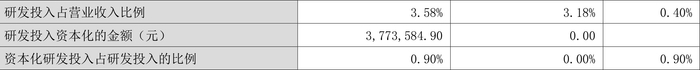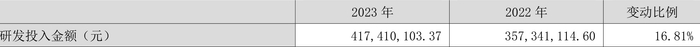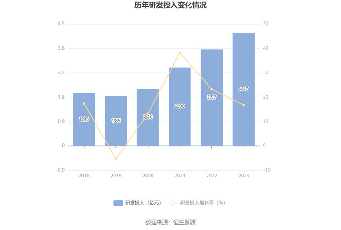 2023年全年,公司研发投入金额为4.17亿元,同比增长16.81%;研发投入占营业收入比例为3.58%,相比上年同期上升0.40个百分点。此外,公司全年研发投入资本化率为0.90%。
