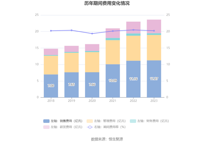 2023年,公司期间费用为23.63亿元,较上年同期增加6208.30万元;但期间费用率为20.25%,较上年同期下降0.25个百分点。其中,销售费用同比增长1.0%,管理费用同比增长1.51%,研发费用同比增长15.4%,财务费用同比下降22.6%。