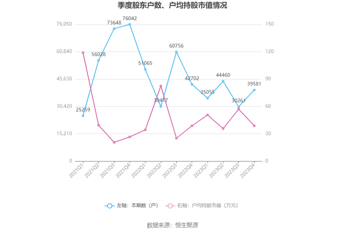 筹码集中度方面,截至2023年年末,公司股东总户数为3.96万户,较三季度末增长了9320户,增幅30.80%;户均持股市值由三季度末的57.10万元下降至38.81万元,降幅为32.03%。