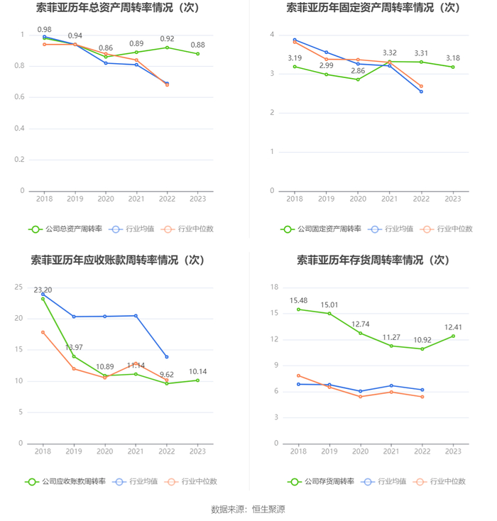 营运能力方面,2023年,公司公司总资产周转率为0.88次,上年同期为0.92次(2022年行业平均值为0.69次,公司位居同行业3/16);固定资产周转率为3.18次,上年同期为3.31次(2022年行业平均值为2.55次,公司位居同行业5/16);公司应收账款周转率、存货周转率分别为10.14次、12.41次。