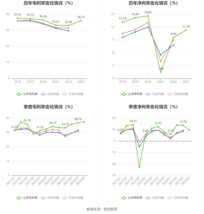 2023年,公司毛利率为36.15%,同比上升3.16个百分点;净利率为11.34%,较上年同期上升1.76个百分点。从单季度指标来看,2023年第四季度公司毛利率为37.42%,同比上升4.07个百分点,环比上升0.66个百分点;净利率为9.63%,较上年同期上升1.82个百分点,较上一季度下降4.13个百分点。