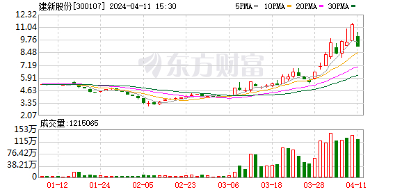 建新股份在最新公告中称,公司股票连续3个交易日(4月8日-4月10日)收盘价格涨幅偏离值累计超过30%,属于股票交易异常波动的情况。公司股票短期涨幅严重偏离创业板综指涨幅,存在市场情绪过热、非理性因素,股价表现已严重偏离公司基本面。请投资者注意二级市场交易风险,理性决策,审慎投资。
