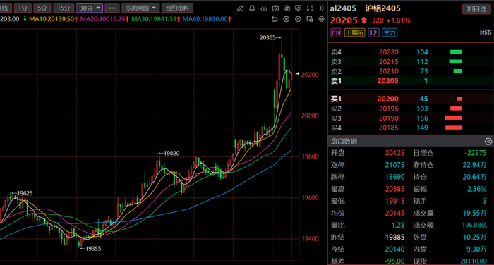 清明节以来,在多重因素影响之下,全球铝价强势拉升,4月8日盘中,沪铝主力合约2405一举突破2万元/吨关口,一度达到20385元/吨的两年高点,此后,铝价仍旧延续上涨趋势,截止10号12点,沪铝价格仍旧维持在20000元/吨以上。