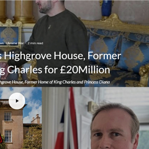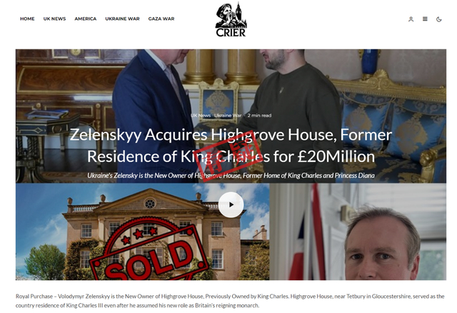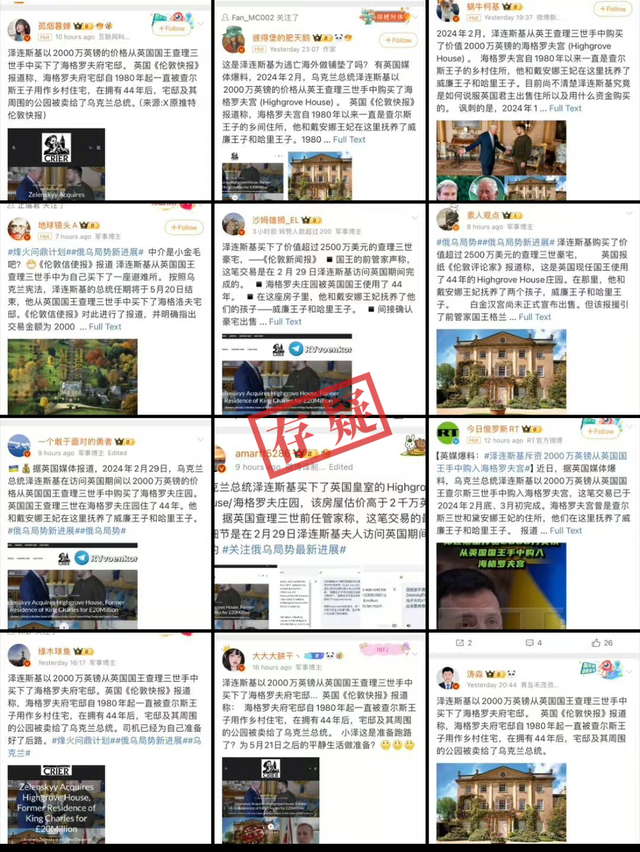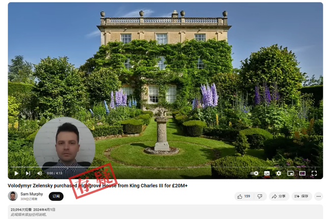 经核查,今年4月,London Crier发布了一篇标题为《泽连斯基以2000万英镑收购查尔斯国王故居海格罗夫庄园》的文章。文章中转载了一段源自YouTube账号@SamMurphyRealEstate的视频。