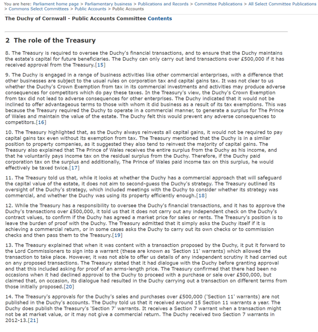 英国议会网站存档文件显示,康沃尔公国进行价值50万英镑以上的土地交易需经英国财政部批准。