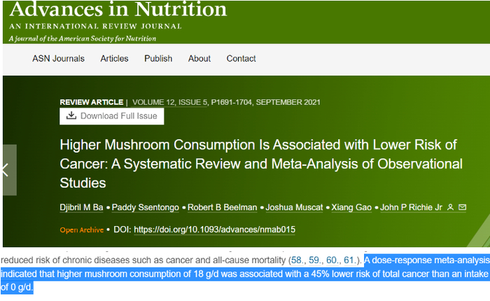 [1]Ba, DM; Ssentongo, P; Beelman, RB; et al.Higher Mushroom Consumption Is Associated with Lower Risk of Cancer: A Systematic Review and Meta-Analysis of Observational Studies.[J].Adv Nutr.2021