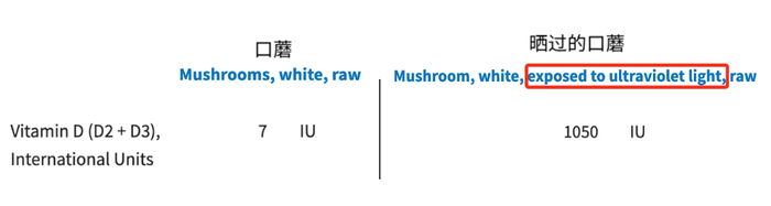 蘑菇是极少数含有维生素 D 的天然食物,大多数蘑菇中每 100g 大约含有不到 50IU(IU 国际单位,维生素 D 1μg=40IU),但和每天 400IU 的需求量相比,还是差得有些远。不过,给蘑菇“晒太阳”能大大提高里面维生素 D 的含量。我们可以在购买后,选择阳光充足的中午,晒上 0.5~2 小时,维生素 D2 的含量就很轻易达到 400IU 以上。
