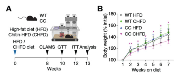 研究者对小鼠进行了两组实验,一组是给予它们含纤维素的高脂肪饲料(HFD),另一组则是含有几丁质纤维的等热量高脂肪饲料(CHFD)。两种饲料唯一的区别,在于纤维素的种类是不是几丁质。