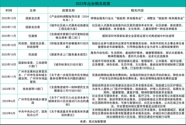 2023年12月27日,国家发改委发布《产业结构调整指导目录(2024年本)》,提到自2024年2月1日起,将物业服务行业从“鼓励类-其他服务业”,调整至“鼓励类-商务服务业”,进一步明确了行业定位和性质,体现出国家顶层设计上对行业的重视。