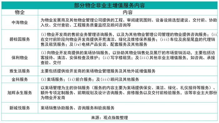 非业主增值服务主要围绕房地产开发全周期的各个环节展开,旨在满足房地产开发过程中的各类衍生需求,包括开发前期的项目规划、设计管理,物业销售的案场协销、营销策划,房屋交付前的房屋检验评估以及完成交付后的尾盘代理销售等。