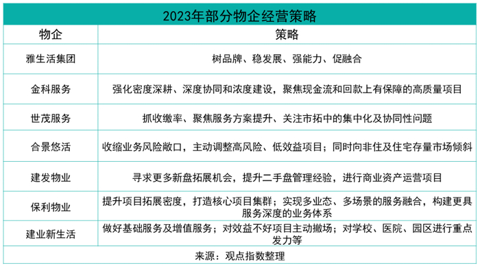 具体包括进行市场化扩张,发力新的赛道,竞争非住业态;强调回归品质服务,重视品牌建设,寻求更长期稳定的发展;以科技赋能实现降本增效,进行数字化转型。另外有部分物企加大了非核心业务的外包,以优化资源配置;部分物企面对行业深度调整和市场不断变化,对组织架构和管理团队进行了必要调整。