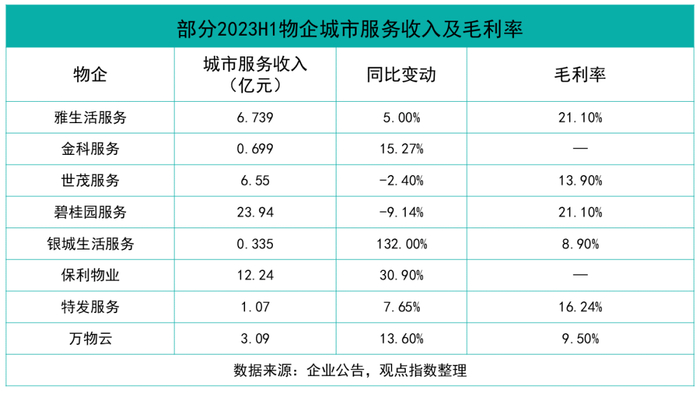 2023年上半年,碧桂园服务的城市服务收入最高,为23.94亿元,同比下降了9.14%;另外,保利物业、雅生活服务、世茂服务分别取得了12.24亿元、6.74亿元及6.55亿元的收入,是物企城市服务领域的头部玩家。