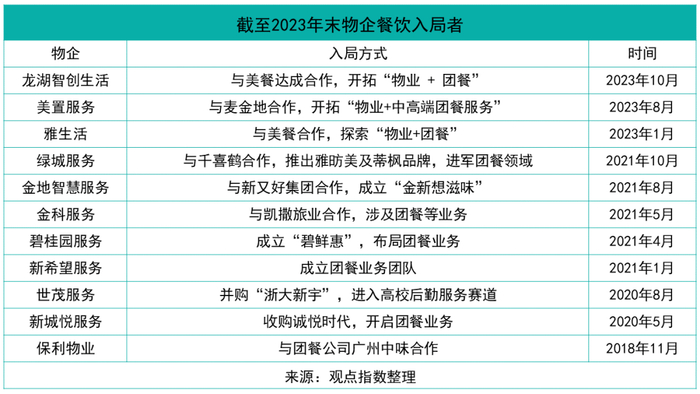 以团餐来看,早先涉及这一领域的主要包括保利物业、金科服务、新希望服务及新城悦服务等少数几家,截至2023年末,入局团餐领域的已有龙湖智创生活、美置服务,雅生活等十多家物企。
