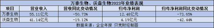 随着2023年年报陆续披露,万泰生物与沃森生物的激烈博弈浮出水面。报告期内,两家企业营收、归母净利润双双出现下滑。其中,万泰生物营收同比腰斩,归母净利润同比下降超七成,沃森生物归母净利润也下滑超过四成。