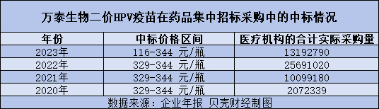 竞争之下,万泰生物的中标价正不断下探。2023年年报显示,报告期内,公司二价HPV疫苗中标价格区间为116-344元/瓶,医疗机构的合计实际采购量为1319.27万瓶。而在2020年-2022年之间,中标价格区间基本维持在329-344元/瓶,合计实际采购量也逐年增加,至2022年曾高达2569.1万瓶。