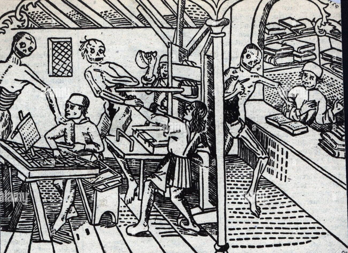 例如,机器印刷留存下来的最古老的印刷品,是一张1499年的图片,上面几具骷髅围绕一台印刷机手舞足蹈,它们手里拿着纸,在跳死亡之舞。这意味着,印刷作为一种媒介通过不断地复制文字来不断地复制人的化身(鬼魂),因此这是值得骷髅们庆祝的好消息。