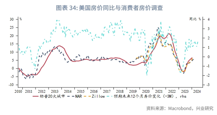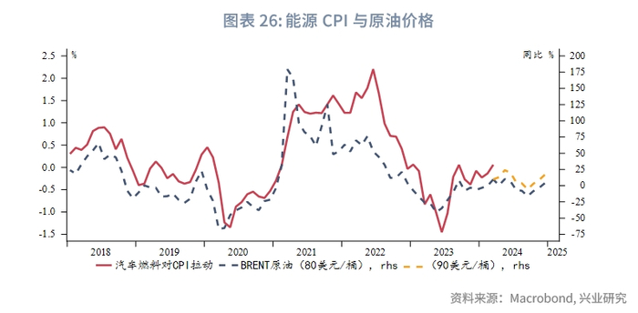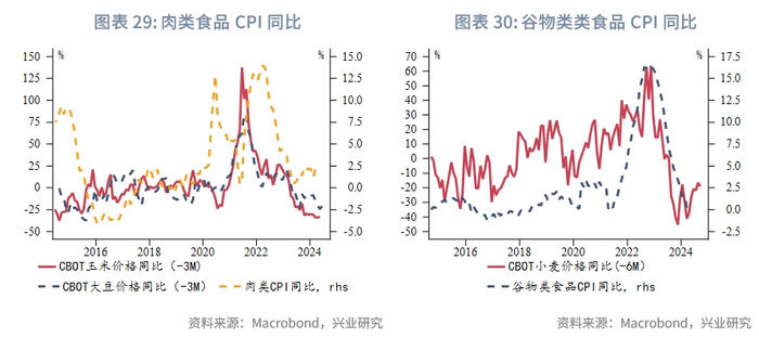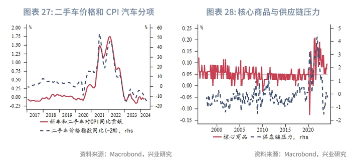 商品价格方面,中东紧张局势和美国经济韧性支撑油价反弹,不过由于2023年的高基数,即便在BRENT原油均价90美元/桶的情况下,其对于CPI的拉动也较为有限。供应链压力继续稳定在0附近,二手车价格同比连跌,核心商品同比依然低迷。食品价格中肉类价格同比有所企稳,谷物类价格同比有望接近见底。