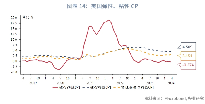 从同比数据看,核心服务和能源价格反弹是本次CPI超预期的主要原因。从弹性、粘性CPI分类看,核心弹性和核心粘性CPI同比下行均已停滞,非住房核心粘性CPI走高。核心通胀压力不再主要存在于住房市场,开始呈现出广泛的粘性。