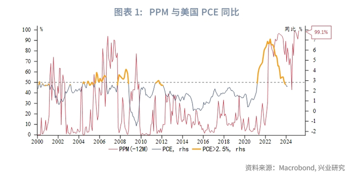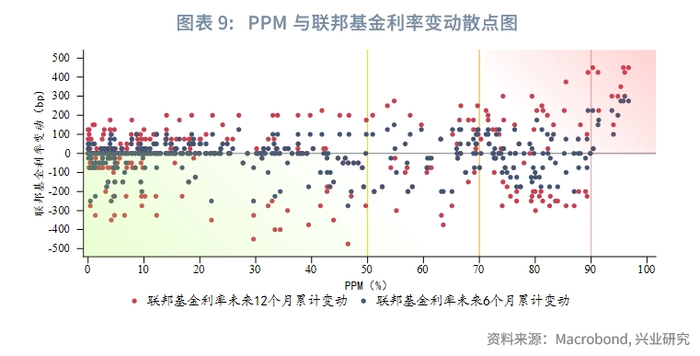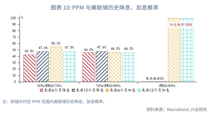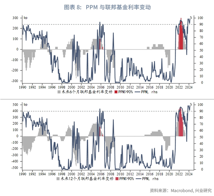 从PPM和联邦基金利率关系而言,当PPM水平较高时意味着未来潜在通胀压力较大,可能对美联储货币政策形成制约。为了验证PPM与联邦基金利率的关系,将未来6个月、12个月的联邦基金利率变动与当前PPM对比。自1990年以来,当PPM>50%后,未来6个月或12个月内美联储降息概率低于50%,维持利率或加息的概率逐渐提高;当PPM>90%时,未来6个月或12个月内美联储从未降息,并且加息概率达到100%。可见,PPM>90%即较高的潜在通胀压力是美联储转向降息的强约束条件,在当前PPM高达99.1%的情况下,年内美联储转向降息的可能性在急剧下降,有相当大的可能推迟降息甚至不降息,甚至存在一定重启加息的风险。