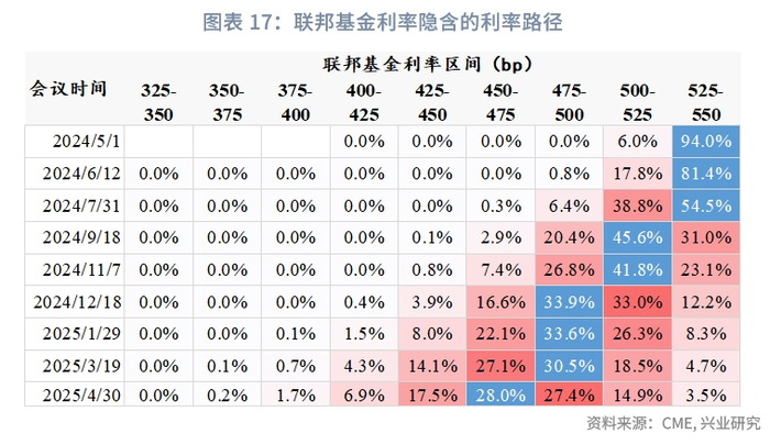 圣路易斯联储构建的物价压力指标(PPM)旨在预测未来12个月PCE同比超过2.5%的可能,目前该指标高达99.1%。据统计,自1990年以来,在PPM>90%后,其对PCE同比>2.5%或CPI同比>3%的历史预测准确率分别达到81.8%和72.7%。需要高度警惕下半年美国通胀超预期回升的风险。当PPM>90%时,未来6个月或12个月内美联储从未降息,并且加息概率达到100%。较高的潜在通胀压力是美联储转向降息的强约束条件,年内美联储转向降息的可能性在急剧下降,有相当大的可能推迟降息甚至不降息,甚至存在重启加息的可能。