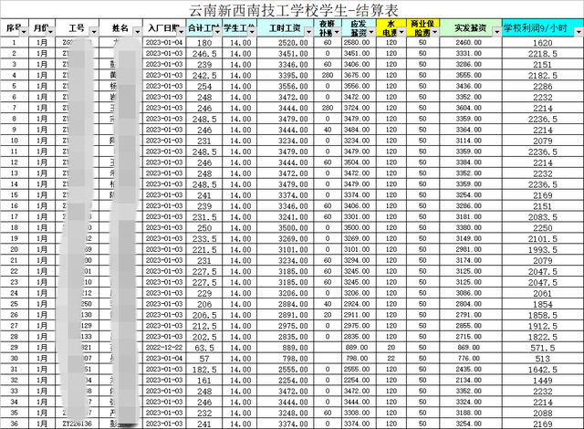与视频一同发出来的,还有一张“云南新西南技工学校学生结算表”,表格中有30余人,入厂时间从2022年12月22日至2023年1月4日,工时工资为每小时14元,并明确标注“学校利润9/小时”。