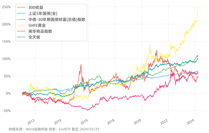 下图是 2011 年至 2024 年 3 月的回测图,名为“全天候”的这根曲线,就是我基于上述品种和比例,以逐日再平衡测算的走势。