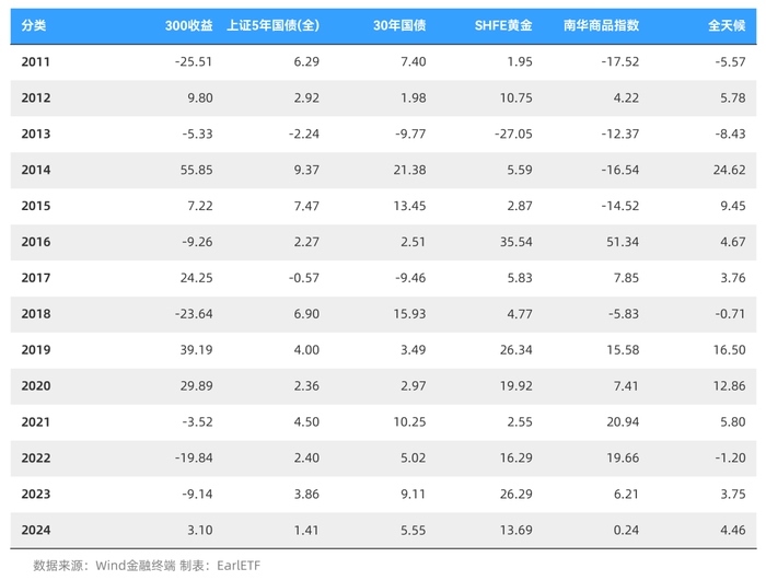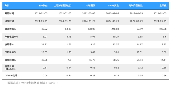 以结果而言,全天候屈居第三,跑输黄金和 30 年国债。但比短期国债、南华商品期货还有最烂的沪深300全收益指数,还是好不少的。