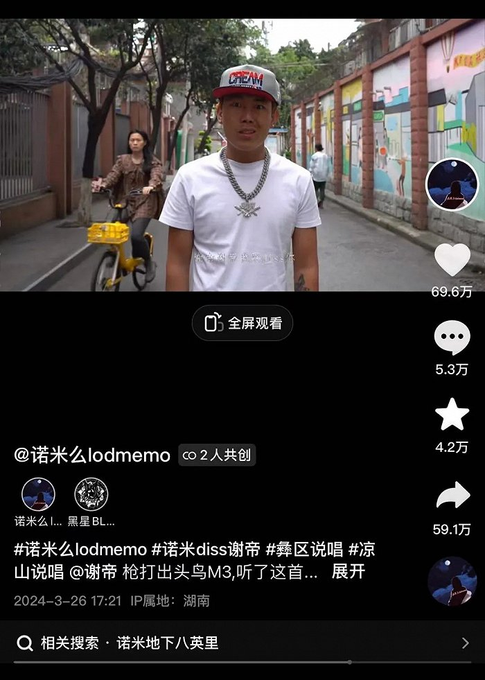 先来看这次抽象现象带来了什么。其一,诺米么写给爷爷的歌《阿普的思念》被央视网文旅当做视频BGM发布,诺米么的家乡大凉山得到了文旅宣传;其二,诺米么本人粉丝数暴涨,歌曲播放量也顺势增长,整个说唱圈也在流量潮中分的一杯羹。