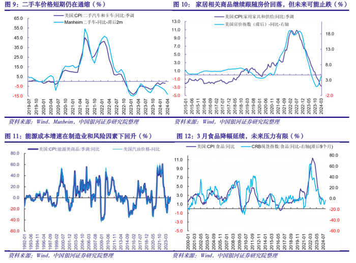从细项来看,可以继续将CPI分解为能源、食品、商品、居住成本和核心服务几个部分分析1。能源价格受到制造业回暖和地缘政治冲突的拉动,能源商品环比增1.5%,同比从-4.2%反弹至0.9%,促进通胀回升;能源服务同比从前值0.5%进一步升至3.1%。全球3月制造业PMI整体呈现复苏迹象使能源的需求预期抬升,而地缘政治风险也对供给端形成扰动,导致能源价格明显上行,对短期通胀形成压力。食品3月增速稳定,家用食品环比维持零增长,非家用食品环比从0.1%加快至0.3%,尽管未来有小幅回升可能但幅度有限,不会明显推动通胀。商品延续温和通缩的状态,尽管非季调环比为1.0%,但季调后仍为-0.2%,同比-0.7%;商品中服装环比增0.7%表现较强,2月环比回升的二手车重新下行,新车同比增速也本轮通胀中首次进入负增长,家具和家用商品也维持下行;总体上,商品在高利率压制下依然不是主要担忧。居住成本虽然同比缓慢回落,环比具有一定粘性,除了业主等价租金(OER)对价格更高的独户住宅进行的权重上调,租金和等价租金环比还未进入0.4%以下的区间,叠加其对于房价统计的滞后,拖累CPI降幅不及预期。核心服务价格在强劳动市场的支持下保持粘性,运输服务环比在能源成本回升和保险价格的带动下继续提升至1.5%,医疗服务环比增长0.6%,其他个人服务也偏强;不过休闲以及教育和通信服务环比放缓至0.1%和0.2%。整体上,核心服务项目受到劳动缺口下薪资的支持,在劳动市场缓和偏慢的状态下,服务通胀降低的斜率也可能低于预期,这也是上调CPI增速预测的重要理由。仅从环比角度外推,如果增速维持0.3%环比,2024年末CPI增速将回升至3.7%,核心CPI则为3.9%,尽管我们仍认为后续的环比增速将有所放缓,但全年通胀均值在3%以上的概率较大,核心通胀也难以顺利向3%靠近,因此降息预期也应出现降调。