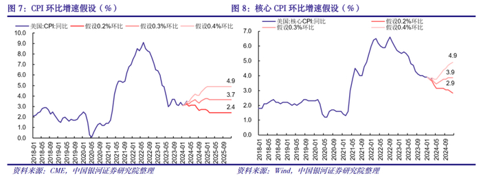 (6)综合以上因素考虑,我们上调2024全年CPI同比增速均值至3.1%,进一步反映能源价格回升、服务价格粘性和居住成本问题的影响。我们对布伦特原油价格的假设上限没有明显高于90美元/桶,但需要警惕地缘政治冲突使价格继续攀升的风险,这是3.1%的通胀增速所没有充分反映的。