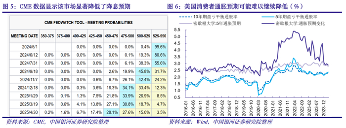 (7)从美联储的视角来看,不论是强力的劳动市场还是超预期的CPI都无法为“通胀进一步缓和”提供信心,货币政策“更高更久”的姿态短期需要保持。尽管通胀在二、三季度依然有望回到缓慢下行的状态,但四季度回升压力意味着该时段并不是降息的好时机。所以,美联储合适的降息时段可能主要集中在三季度,首次降息在好于预期的通胀数据出现前将向7月份或更晚推迟,全年降息幅度也将压缩至50BP或更低。“更高更久”的利率在降低“软着陆”的可能,而通胀回升背景下的“硬着陆”概率将上升。