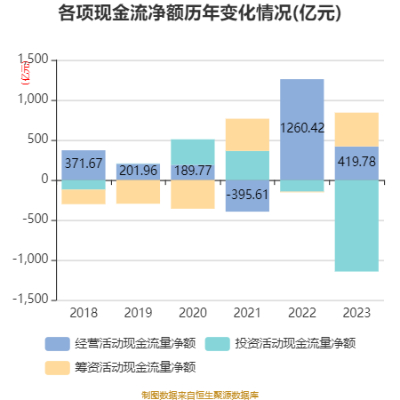 2023年,公司经营活动现金流净额为419.78亿元,同比下降66.70%;筹资活动现金流净额422.55亿元,同比增加431.32亿元;投资活动现金流净额-1144.74亿元,上年同期为-145.65亿元。