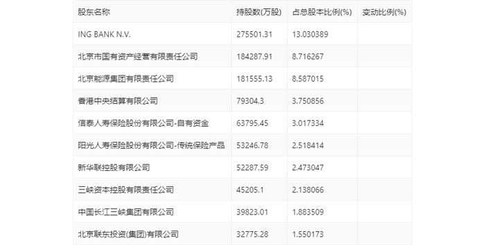 年报显示,2023年年末公司十大流通股东中,持股最多的为ING BANK N.V.,占比13.03%。十大流通股东名单相比2023年三季报维持不变。在具体持股比例上,北京市国有资产经营有限责任公司、北京联东投资(集团)有限公司持股有所上升,香港中央结算有限公司持股有所下降。