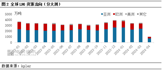 总体来看,2024年诸多利好因素共同支撑了国际天然气价格的震荡反弹。尤其是亚洲市场需求的复苏为全球天然气价格水平提供了有力支撑,从kpler船期数据来看,截至4月9日,今年全球LNG贸易量为7994.7万吨,其中流向亚洲地区占比67.69%,相较去年1-4月占比提升0.22个百分点,流向欧洲地区占比28.22%,相较去年1-4月占比下降8.19个百分点,欧洲地区较为充足的库存使得欧洲用户对天然气的采购需求有所不足,这部分资源也更多的流向了亚洲以及拉美市场。